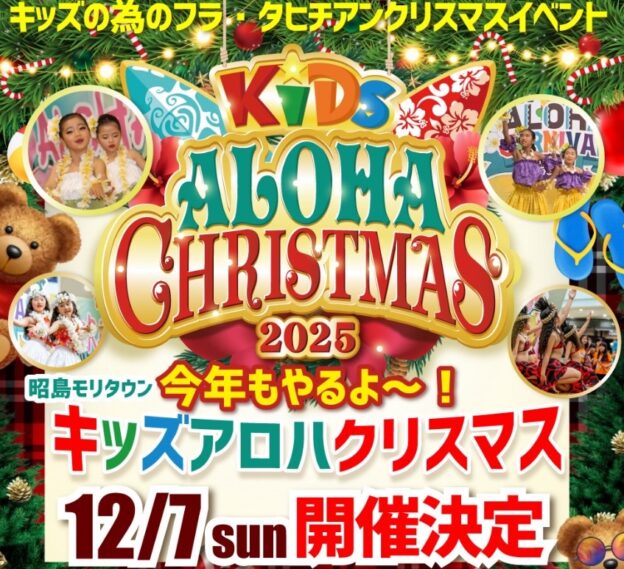 【インフォメーション】出演情報 12月7日 (日)“キッズアロハクリスマス 2025”昭島モリタウン東館1F 光の広場 今年もリサフラのケイキ💖 可愛い子供達が踊ります~‼ ちびっ子軍団が6人と少しお姉さんが3人です✨ 応援よろしくお願いいたします!